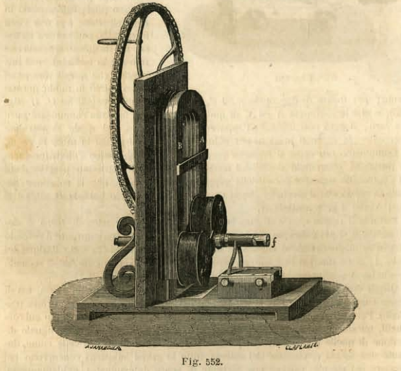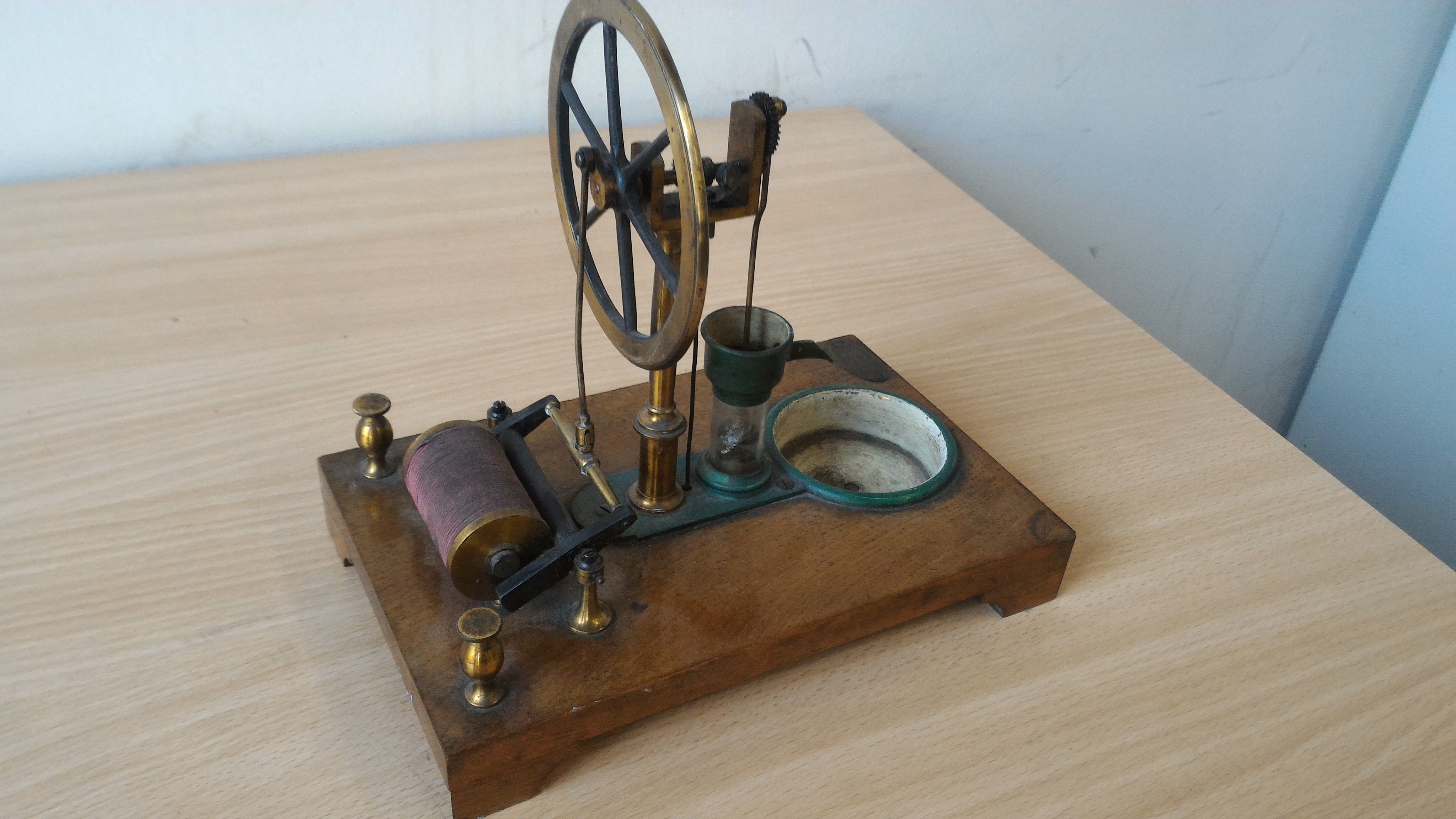 Un piccolo elettromagnete concentrato di elettromagnetismo, alimentato una tensione di pochi volt, fa funzionare la pompa elettromagnetica meccanica e idraulica. Al passaggio della corrente l’elettromagnete fa ruotare verso l’alto o verso il basso un bilanciere, collegato ad un’asta metallica che trasmette a sua volta il movimento ad un volano. Sull’albero del volano ci sono due contatti che fanno chiudere il circuito elettrico due volte ogni giro e precisamente nei momenti in cui le estremità del bilanciere si trovano sopra e sotto rispetto al nucleo dell’elettrocalamita. Quindi, una volta avviata manualmente la rotazione del volano, questo comanda il passaggio di corrente all’elettrocalamita che, a sua volta, mantiene in movimento il volano. Un ingegnoso sistema di trasmissioni meccaniche permette le trasformazioni dal moto rotatorio del bilanciere quello rettilineo dell’asta, quindi nuovamente al moto circolare del volano, per finire con un moto rettilineo trasmesso dal volano ad uno stantuffo che aspira acqua e la riversa nella vaschetta di provenienza.
