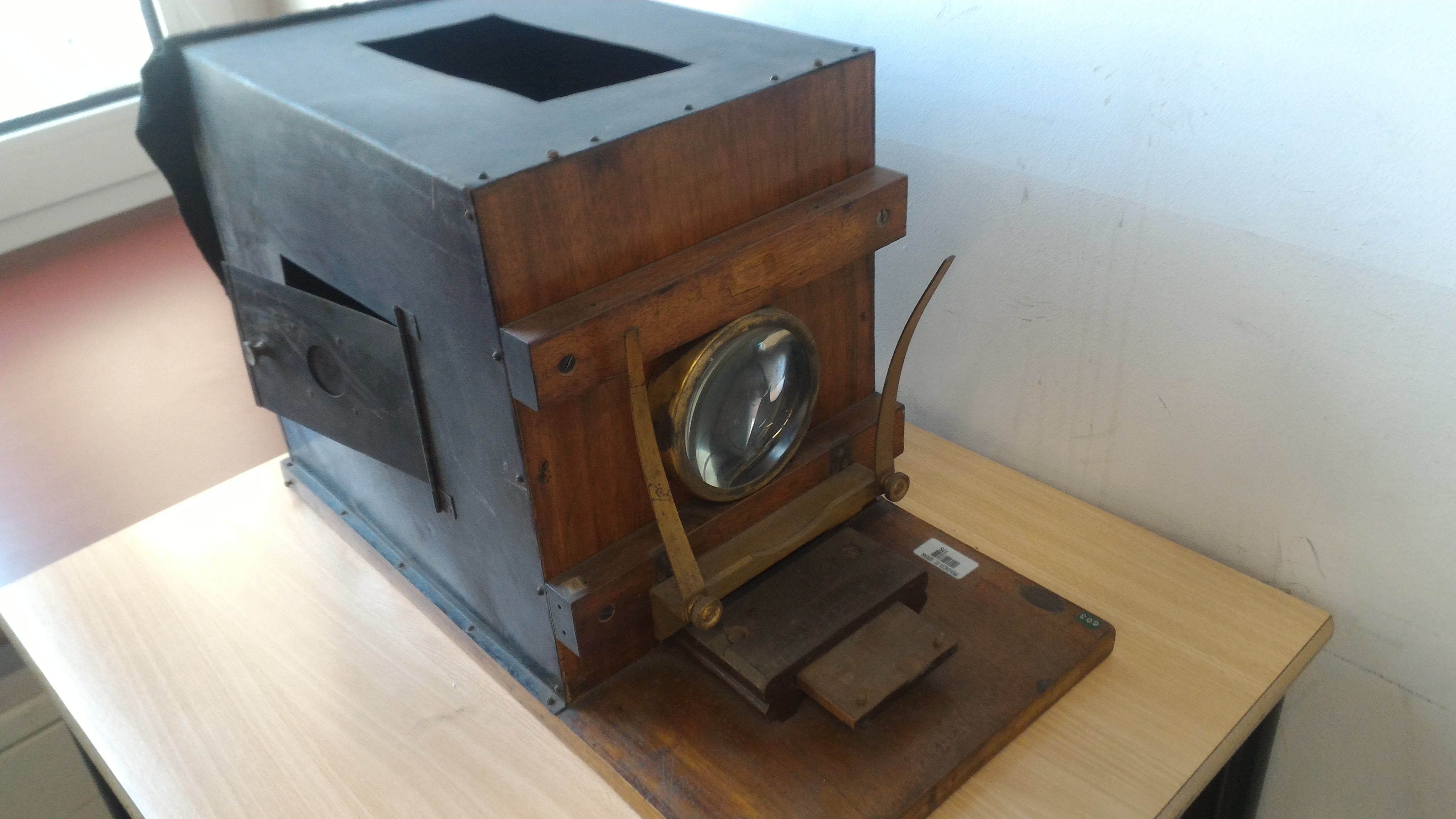 La lanterna da proiezione è costituita da una scatola in legno che contiene una sorgente luminosa, la cui luce viene riflessa da uno specchio concavo. L’immagine da proiettare viene collocata in un telaio tra la sorgente luminosa e la lente. Verso la metà dell’Ottocento la fiamma fu sostituita dall’arco voltaico, una scarica elettrica che emette una luce molto più intensa. Lo spioncino laterale, chiuso da una spessa lastra di vetro brunito, permetteva all’operatore di guardare all’interno e di regolare la distanza fra i carboni, senza accecarsi.